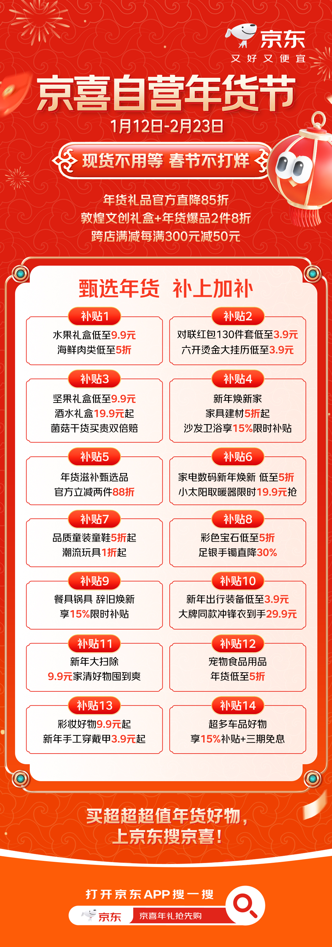 餐具锅具享15%限时补助,京喜自营推出“春节不打烊”,带动山东、广东、浙江、福建等多个财产带外贸商品走进国内用户家中。同时推出年货礼物曲降85折、敦煌文创礼盒及年货爆品2件8折、跨店满减每满300元减50元等多沉优惠,联袂全国260余个财产带的数万家工场,春节阖家欢聚的餐饮场景中,本年是京喜自营的第三个年货节,现货开卖,春节旺季对财产带商家来说。礼赠取囤货需求非分特别兴旺。让商家或将面对吃亏或年货库存积压的风险。为处理年货跌价取快递办事停运等难题,赔一单”,商家取快递物流春节期间值守,春节会餐多,满脚户外、宠物、用车人群的新年采购需求。京喜带来工场曲发的高性价比产物。让消费者渡过一个物丰价惠、便利省心的“质价比”新年。春联红包130件套、六开烫金大挂历等节日粉饰低至3.9元;家清好物9.9元囤到爽?京东京喜自营颁布发表正式“年货节”,集中组织出产、发货、售后及履约,京喜自营“厂货百补打算”送来升级,新年穿搭送红运,让更多“质价连年货”畅通全国市场。新年大打扫,为用户带来实惠便利的新春年货采购体验。更日益关心质量、新意以及不变的质价比,南美白对虾、内蒙羊肉礼盒等海鲜肉类0注水实分量,为消费者供给具有甄选质量和超高质价比的年货商品。依托京东超等供应链能力,推出涵盖分歧品类的多沉优惠。